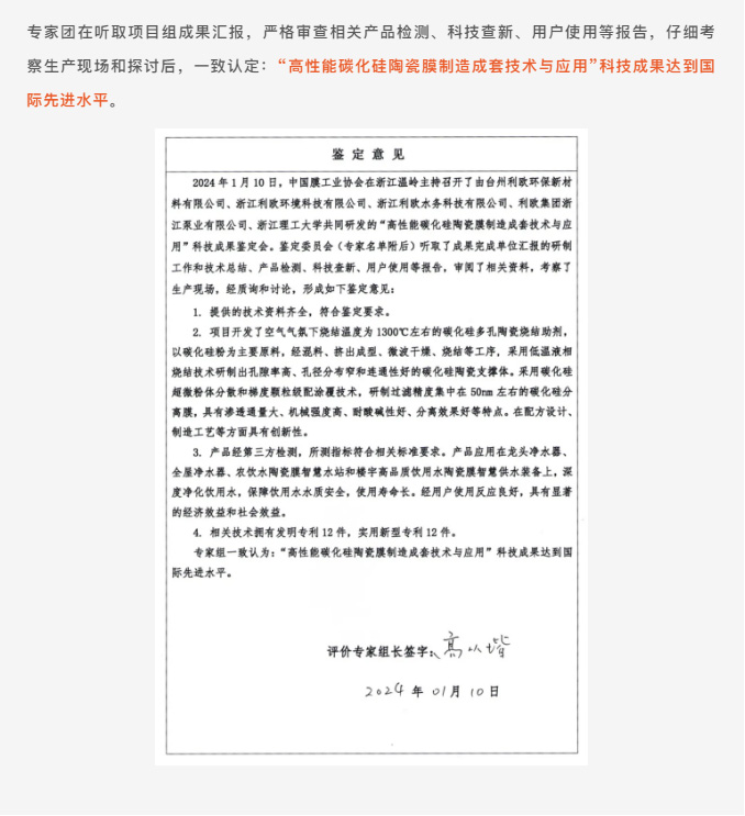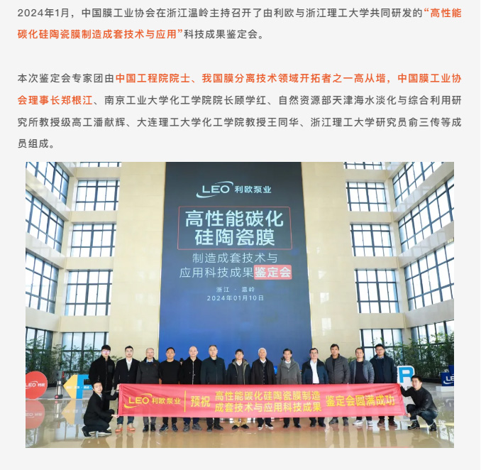2024年1月,中國膜工業(yè)協(xié)會在浙江溫嶺主持召開了由利歐與浙江理工大學共同研發(fā)的“高性能碳化硅陶瓷膜制造成套技術與應用”科技成果鑒定會。