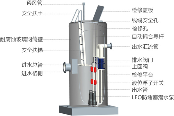 預(yù)制泵站為整體安裝;泵站內(nèi)設(shè)備如泵、格柵維護(hù)時(shí)均無需進(jìn)入筒體內(nèi),直接由頂部吊進(jìn)吊出;在內(nèi)部管道系統(tǒng)則在泵站內(nèi)設(shè)有檢修平臺和上下爬梯。